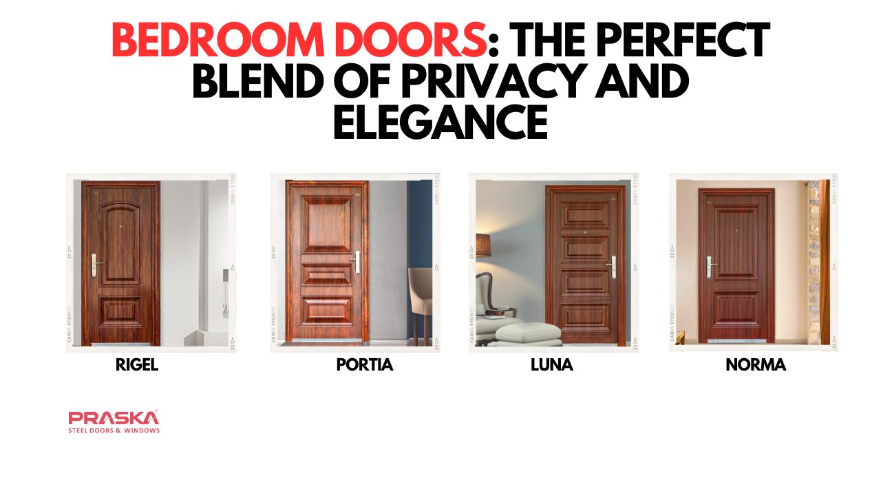 The correct bedroom doors entail a mix of style, functionality, and durability to match the design and purpose of your space. You should select materials that match your requirements—wooden doors provide a classic and warm look, while steel adds strength with a modern touch. Praska's bedroom's modern door designs exemplify this aspect, combining aesthetics with the quality of the materials.